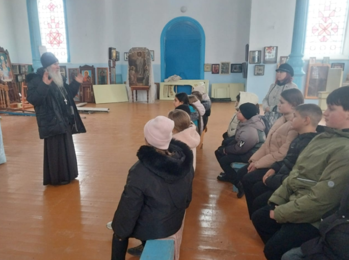 Во время беседы настоятель провел устный опрос учащихся, веруют ли они в то, что Бог есть, подавляющее большинство ответили утвердительно. Дальнейший разговор показал, что мало кто из детей знает, что требуется от верующего человека, в лучшем случае отвечали, что надо делать добро. На самом деле, почти все нормальные люди понимают, что надо делать хорошие поступки, но на деле далеко не у всех это получается, и не всегда. А причина кроется в том, что не хватает убежденности или смелости сделать правильный выбор между добром и злом. Священное Писание учит, что «Неверный в малом не верен и в большом». (ср. Евангелие от Луки гл. 16 ст. 10). Вот и получается: для того, чтобы совершать правильные поступки, надо стараться жить так, как учит Церковь Христова. Если человек верит в Господа, то надо непременно изучить, чего от нас ждет наш Создатель, зачем мы родились на свет, и важно найти себя в жизни. Иисус Христос сказал своим ученикам: «если любите Меня, то соблюдите Мои заповеди» (Евангелие от Иоанна гл. 14; ст. 15). А заповеди заключают в себе Закон, данный нам Творцом, и Закон этот основывается на любви к Богу и к ближнему своему. Ведь, действительно, кого мы любим, тех не обижаем, к тем прислушиваемся, и теми дорожим. На примере святых людей мы можем узнать, что святые научились любить не только тех, кто их любил и делал им добро, но они любили даже тех, кто их ненавидел, обижал и делал им всякое зло. Святые научились во всяком человеке видеть образ Божий и относились ко всем с большим почтением, побеждая зло добром. За это Бог Сам ограждал их от многих бед и опасностей, а после смерти принял их в Свою райскую обитель, где отер всякую слезу от их очей. Надо сказать, что и Сам Спаситель много претерпел зла от недобрых людей, но Он им прощал, давая время для покаяния, и, даже пребывая в страшных муках на Кресте, молился за своих распинателей.